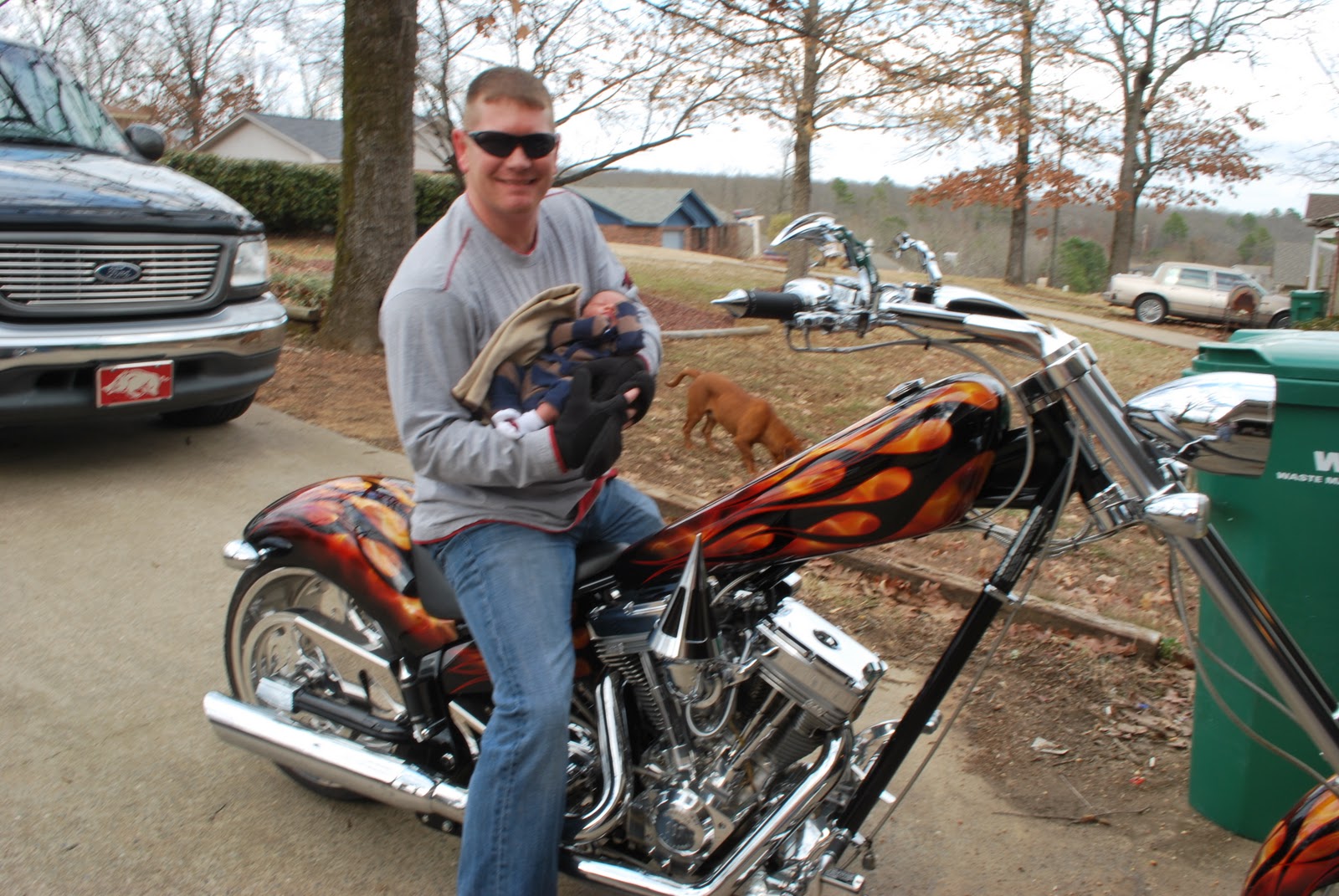 We are truly blessed to have such a cute baby...Lacy and I love being a family and now with our new little addition, life is better:) He loves bath time until he has to get out, we have story time daily (we read nursery rhymes, curious george, and anything with a dinosaur in it.lol), and of course Lacy has already had Luke out on his precious motorcycle (no the bike was not running)!!!